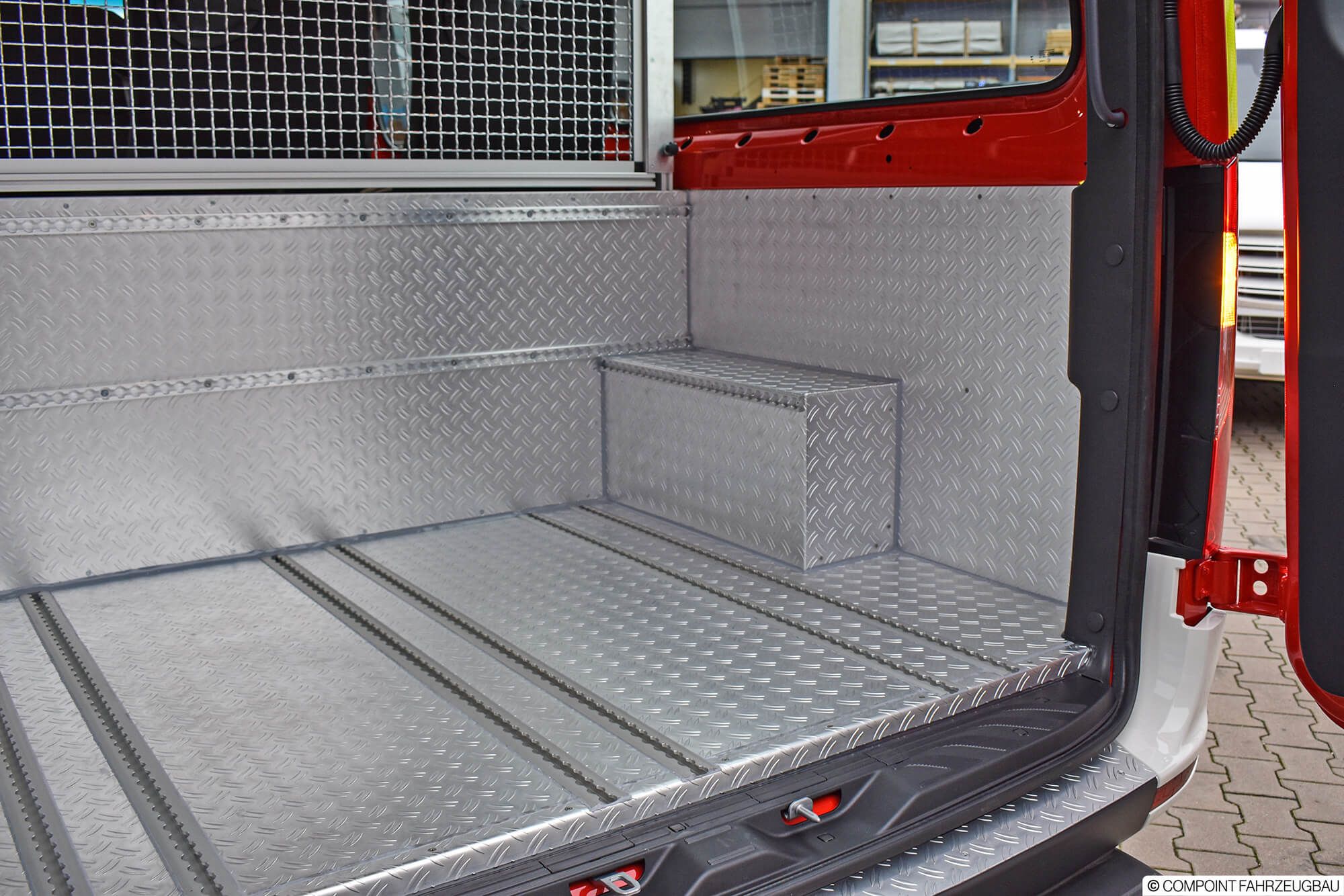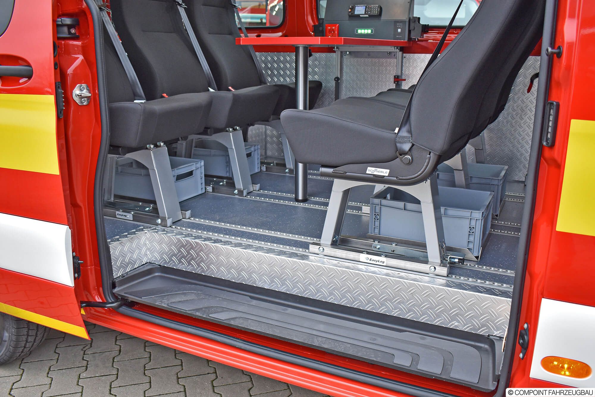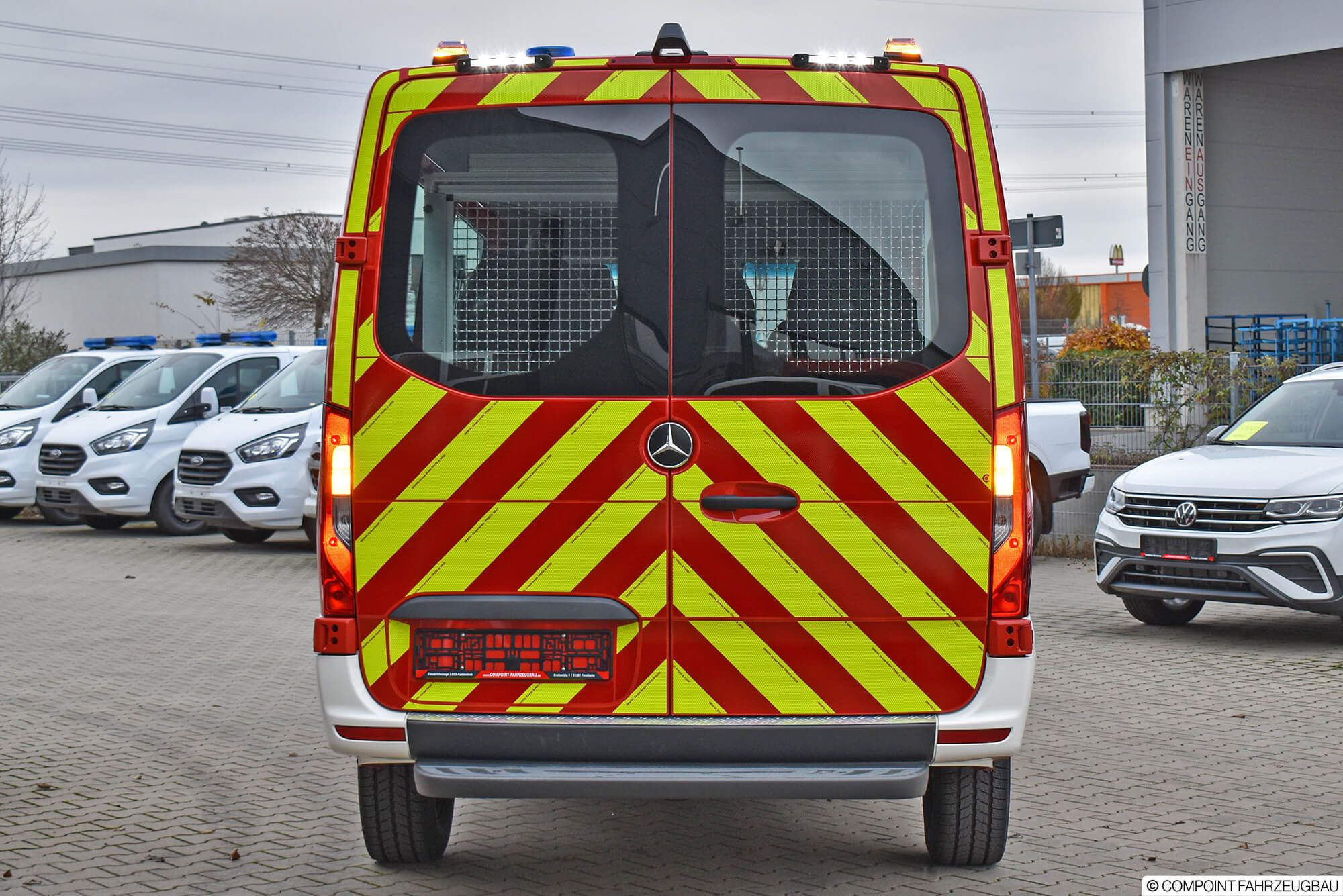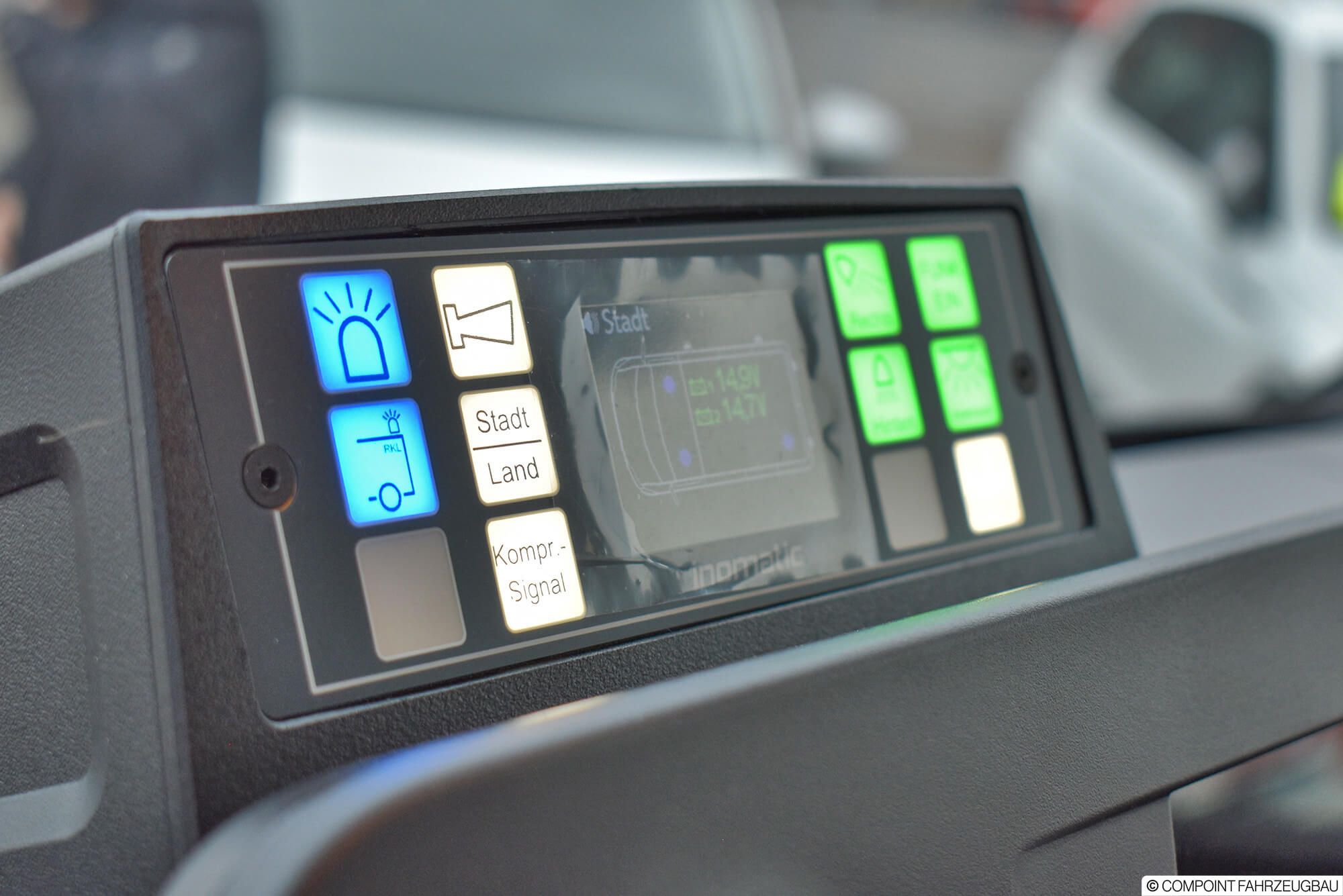 - Hänsch DBS5000 LED Signalbalken - Hänsch TFA624 Sondersignal - 3. Kennleuchte am Heck - Schnierle Systemboden mit 6 Einzelsitzen - Aluriffelblechverkleidung - Trenngitter zum Laderaum - Funktisch/Besprechungstisch - inomatic Bediensystem CAN - Umfeldbeleuchtung LED - MRT mit 2 Sprechstellen - Ladestromeinspeisung - Sinuswandler 12V/230V - Lagerung der Beladung - Beklebung und Warnmarkierungen