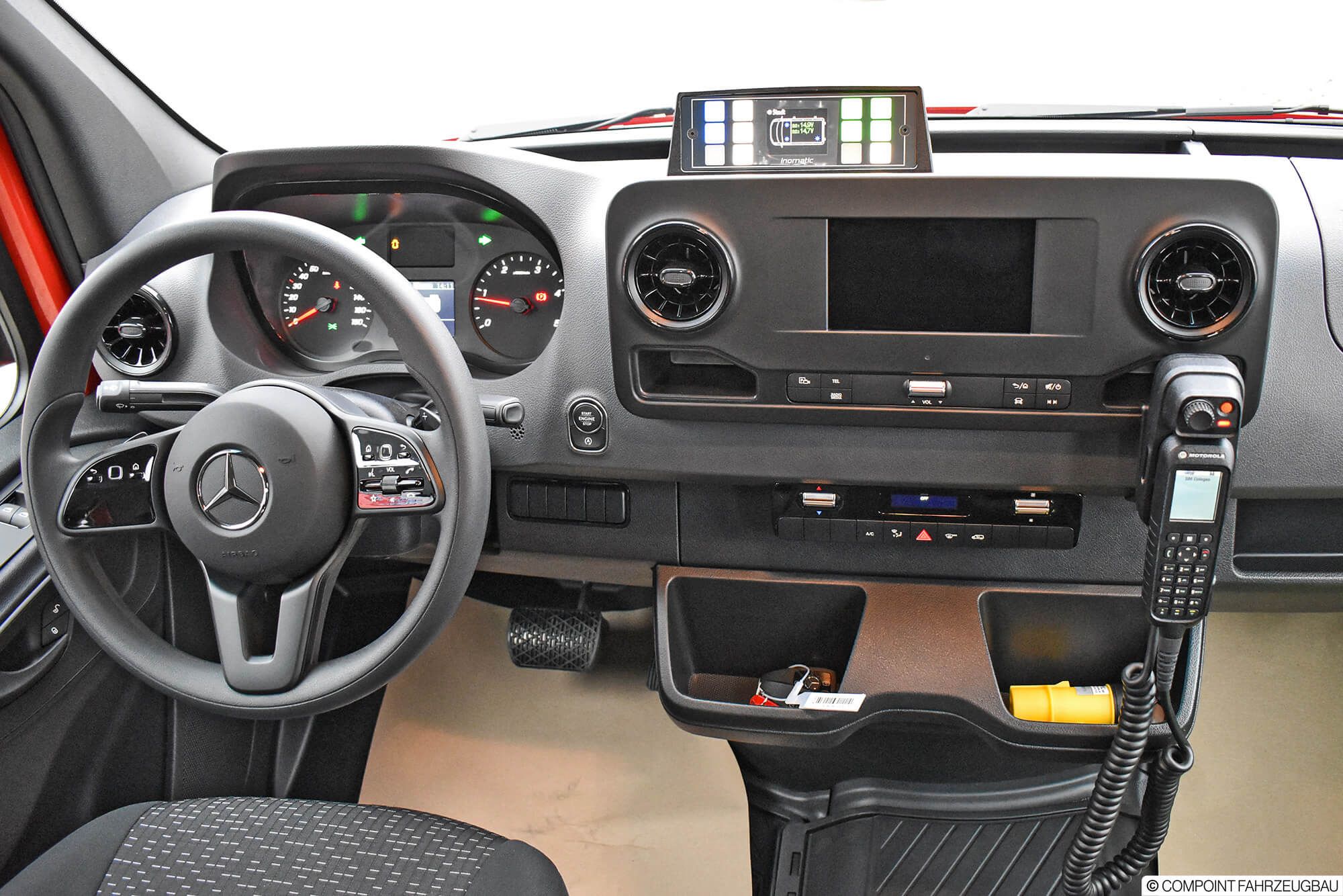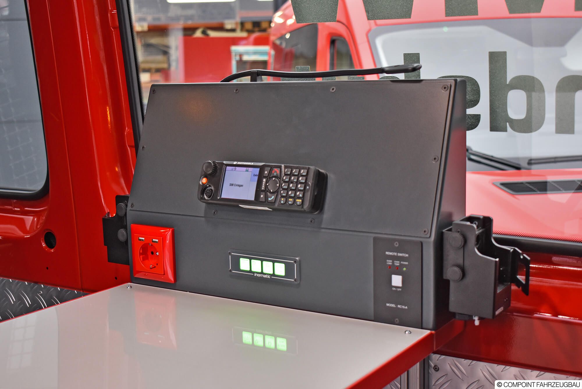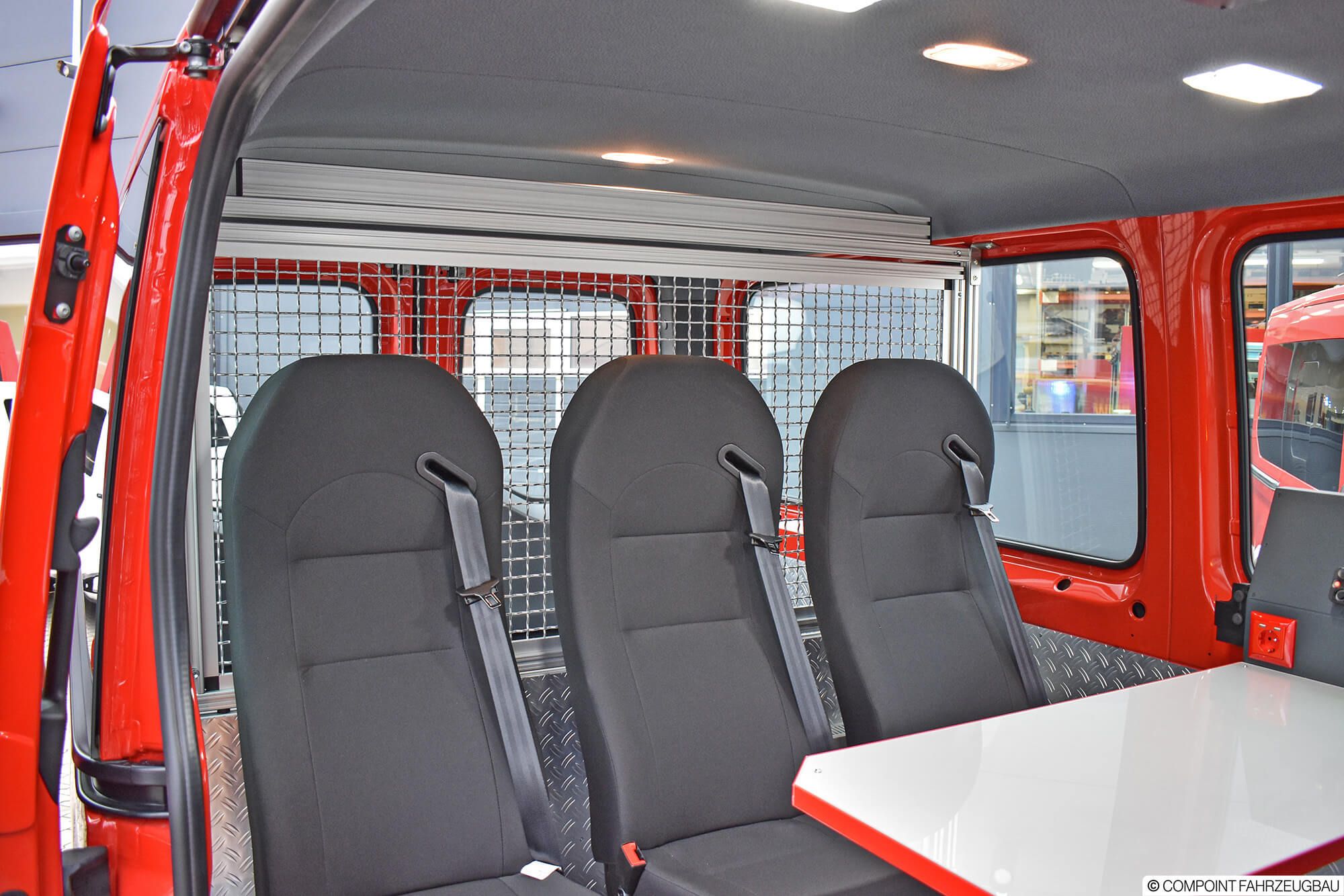 - Hänsch DBS5000 LED Signalbalken - Hänsch TFA624 Sondersignal - 3. Kennleuchte am Heck - Schnierle Systemboden mit 6 Einzelsitzen - Aluriffelblechverkleidung - Trenngitter zum Laderaum - Funktisch/Besprechungstisch - inomatic Bediensystem CAN - Umfeldbeleuchtung LED - MRT mit 2 Sprechstellen - Ladestromeinspeisung - Sinuswandler 12V/230V - Lagerung der Beladung - Beklebung und Warnmarkierungen
