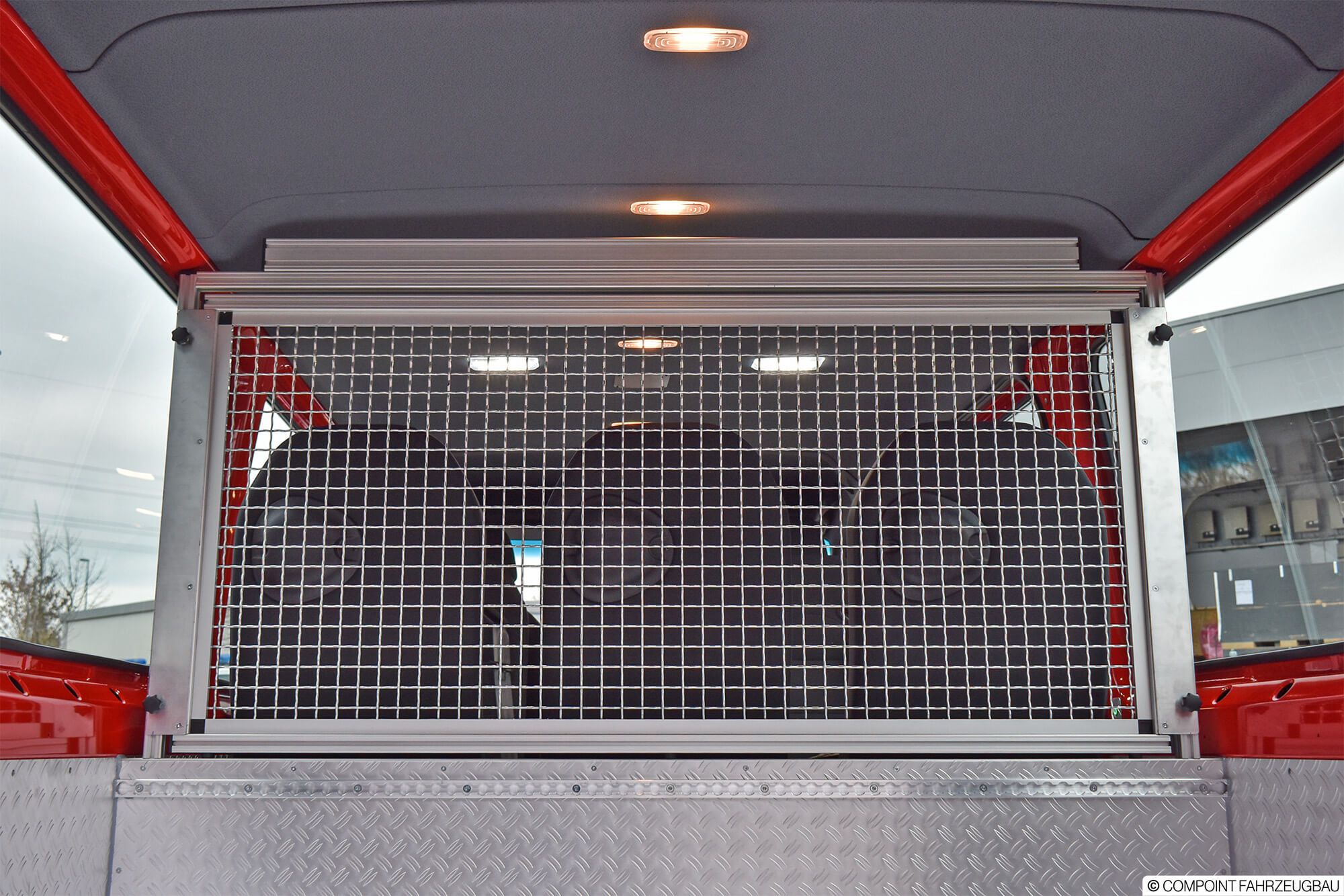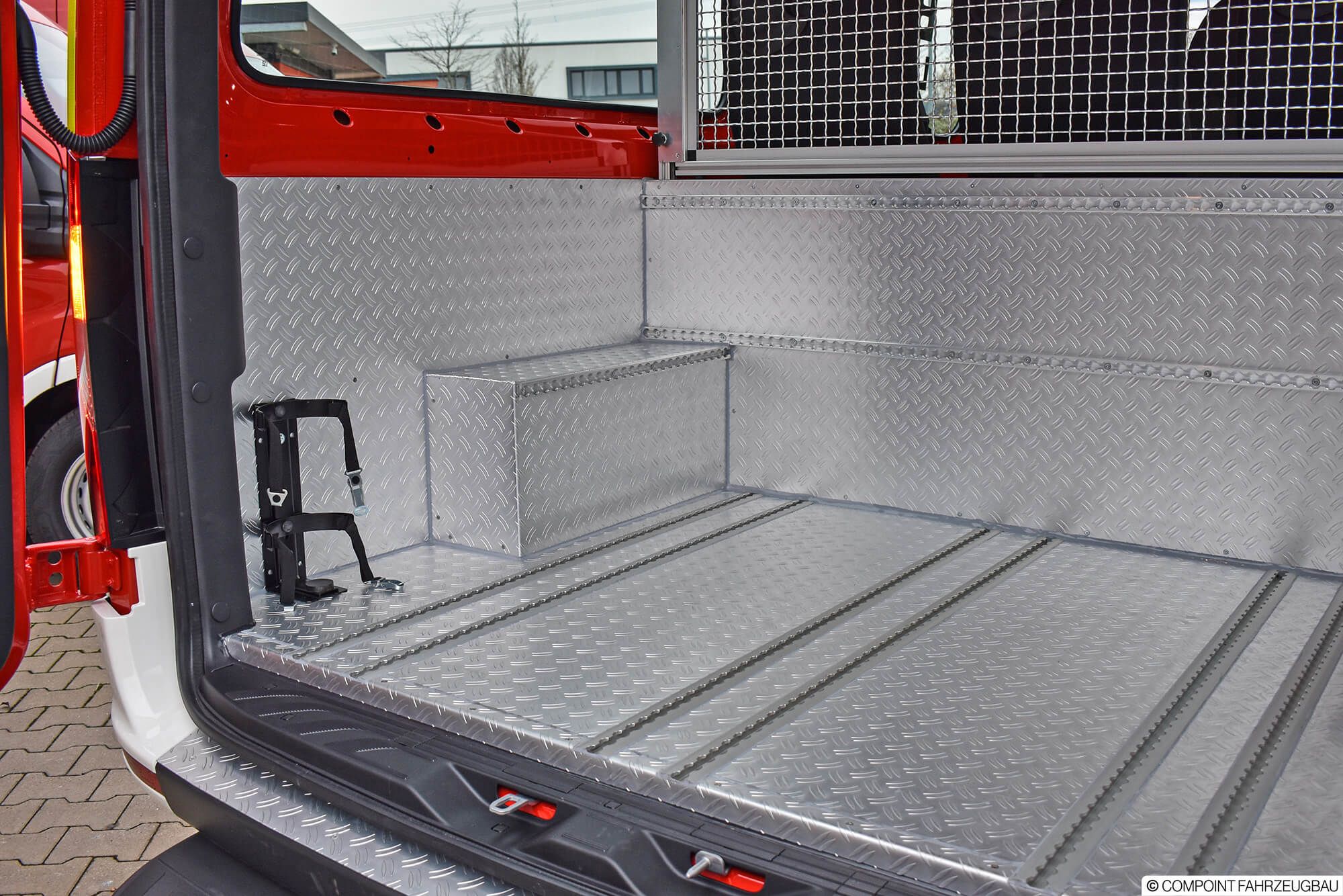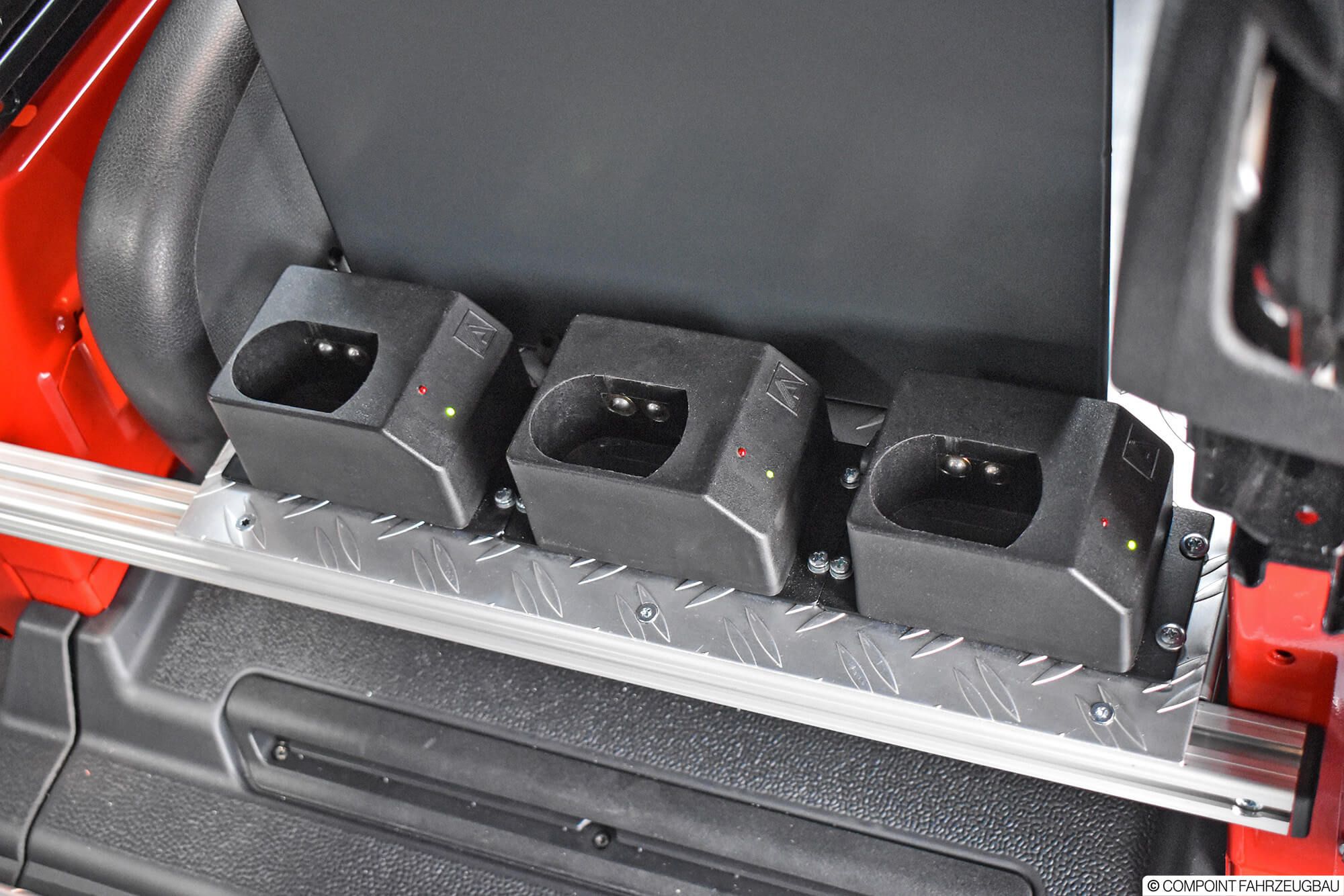 - Hänsch DBS5000 LED Signalbalken - Hänsch TFA624 Sondersignal - 3. Kennleuchte am Heck - Schnierle Systemboden mit 6 Einzelsitzen - Aluriffelblechverkleidung - Trenngitter zum Laderaum - Funktisch/Besprechungstisch - inomatic Bediensystem CAN - Umfeldbeleuchtung LED - MRT mit 2 Sprechstellen - Ladestromeinspeisung - Sinuswandler 12V/230V - Lagerung der Beladung - Beklebung und Warnmarkierungen